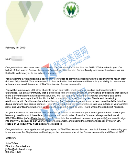 留美网C同学喜获温彻顿中学The winchedon school的录取offer