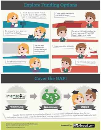 以下的信息图表希望可以帮助留学生知道自己在美国留学时有什麽方法可以增添经费。图表中,Renata 和 Cristian 两位都是来美国读书的国际学生,一位在私立大学上课,另一位在社区大学上课。和63%的国际学生一样,他们的主要留学经济来源都是来自家庭或父母资助。然而,当一但发生了突发事件没有了这主要资助,他们就需要自己找方法来维持留学生涯。