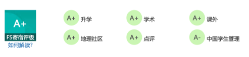 目前,学校页面上的评估卡(如下所示)包含了一个整体评级和6个大项评级,共计46个数据点组合而成。6个大项评级为:地理周边,学术实力,升学水平,课余活动,FindingSchool点评以及中国学生管理。在学校页面中,您能清晰得知学校的总评打分与各维度打分(从A+到C),寄宿学校还有详细的总分排名评估与排名所使用的数据主要有三个来源,学校官方数据,公共数据和FindingSchool用户自主提交的数据。