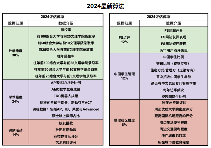 2.【24%-学术维度】:课程数据(AP,IB,荣誉与Advanced)、硕士以上教师占比、AP考试3/4/5分比例、标准化考试平均分(新SAT与ACT)、AMC数学竞赛成绩、FRC机器人成绩等;