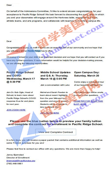1月15日是大部分美国私立高中的常规申请截止日,但仍有部分顶尖私校将截止日期延后至2月1日,为错过早申的学生提供了宝贵机会。下面就让我们一起来看看还有哪些顶尖私立高中有名额~ 一、圣卡塔利娜学校Santa Catalina School Santa Catalina School是一所位于加州著名的度假城市蒙特雷市的女校,学校占地面积为36英亩。从旧金山到圣卡塔琳娜学校开车只有两个小时的车程,学校距离加利福尼亚海滩仅5分钟车程,风景优美。因为距离海洋进,学校的海洋资源也很丰富。学校艺术不错,尤其是学生艺术和摄影展览,其中由ZFX特效公司制作的《欢乐满溢》的全面音乐制作,以及埃德温·德鲁德之谜和昏昏欲睡的监护人在中部海岸首映。 学校优势: 1、学校的海洋生物很强,除了有海洋生态学的研究课程之外;还有学校周边有很多海洋研究机构,如Montery Bay海洋馆,供学生研究以及学习。 2、学校的艺术很棒,无论是视觉艺术还是表演艺术;舞蹈种类丰富,除了常规课程外,提供AP音乐以及高级戏剧课程。 3、学校提供独一无二的Journey课程:从9年级开始学习,直到毕业,帮助学生提升领导力以确保他们很好的进入大学。每周有指导老师会议,也有两周一次的住宿老师会谈以及一对一的私人谈话等。 4、学校的TEDx活动独一无二,是由学生发起的一个club。不仅每年都有TED的课程,同时在TED的基础上增加了TEDX,旨在通过TED演讲促进与知名人士的对话。 二、拉荷亚国家走读学校La Jolla Country Day School 拉荷亚国家走读学校建立于1926年,位于加州圣地亚哥最有名的富人区拉荷亚,学校有加利福尼亚私立学校协会(CAIS)和西部学校及大学协会(WASC)的认证,还是独立学校协会(NAIS)的理事会成员。 拉荷亚国家走读学校有留美网学生就读,该校宗旨是让孩子成为领袖。每年有8%的学生录取到常春藤名校,包括哈佛大学、哥伦比亚大学、宾大、普林斯顿大学、耶鲁大学等世界名校。学校的创新实验室是按照大学实验室标准修建的,也有专门的视觉艺术与科学中心大楼。我们有学生就读,对学校评价非常高。 学校优势: 1、从2012年至今,拉荷亚国家学校在10项体育项目中得到过33次冠军。 2、学校建立了创新实验室,邀请行业内的专家来为学生提供最先进的课程。2015年,设计与创新课的学生们在老师的指导下完成建造一台镭射切割机,并申请专利。 3、大学申请辅导团队:学校有经验丰富的大学申请指导团队,从9年级开始即为学生规划大学申请准备。同时,学校每年组织11年级的学生进行为期一周的大学深度访校活动(东岸、中部、西岸) 4、视觉和表演艺术:有超过27项的艺术类课程供学生选修,学校每年都有戏剧及音乐的演出,声乐及乐器的表演以及舞蹈秀。 5、国际生项目:十分注重国际学生。每个学年都安排本地学生大使与新国际学生结对,帮助其更快地适应学校的学习和生活。 三、特巴律法社区学校TVT Community Day School TVT Community Day School有2个校区,高中部位于加州的尔湾,宽敞的21.5英亩山坡校园获得了美国建筑师协会(American Institute of Architects)享有声望的“荣誉奖”。学校有150,000平方英尺的先进设施,体育馆和两个大型运动场,先进的数字电影制作工作室等,还可以使用邻近的Merage犹太社区中心的奥林匹克规格的游泳池和体育馆。 学校优势: 1.学术优秀,大学毕业走向非常好,2020年68%的毕业生升入美国新闻与世界报道的排名前50大学或文理学院。 2.数学课程设置丰富有AP课程、荣誉课程,以及AoPS课程 3.学校环境优美,宽敞的21.5英亩山坡校园获得了美国建筑师协会(American Institute of Architects)享有声望的“荣誉奖” 4.艺术方面:高中生优秀作品可以参加每年的TVT南加州高中电影节 5.TVT创新计划:将工程,科学,数学和电影中程序与TVT的核心课程整合在一起。从TK到12年级学生有很多机会创新课外活动计划中探索创新学习的主题,特色是技术,机器人技术,设计,视觉艺术,分子美食等课程。 四、太平洋峻岭学校Pacific Ridge School 太平洋峻岭学校Pacific Ridge School位于加州圣地亚哥北部的Carlsbad社区,紧邻加州大学洛杉矶分校,成立于2007年。该社区是许多高科技公司的总部,有许多科技公司的高管子女都就读于此校,77%以上的老师都有硕士或以上学历。 学校优势: 1.学术卓越,短短12年就跻身于圣地亚哥排名前三的私立学校。 2.采用独特的Harkness讨论式教学方法,使学生通过讨论,运用批判性思维和创造性的推理,从而达到学习的目的。 3.注重培养学生的全球视野与领导力。每个学年末,全校每个年级的学生都会参加为期两周的世界游学,老师们将游学与学术课程相结合,达到游与学的双重目的。目前为止,学校的师生已经访问过50个不同的国家和地区。 4.丰富的STEAM课程与实践,还设有专门的创新实验室,提供3D打印机、激光切割等工具,让学生们可以将自己的设计变成现实。 5.国际生比例低,每年只有3个名额。 6.教学设施也是圣地亚哥所有私立学校中数一数二的:专门的科学与艺术中心大楼,包括8间高科技化学、生物、物理实验室,8间艺术教室,3间音乐练习室以及专业的录音摄影棚等。 五、弗朗西斯帕克中学Francis Parker School 石老师曾走访考察过该校,弗朗西斯帕克学校成立于1912年,是圣地亚哥历史最悠久、规模最大、男女合校的私立走读学校,从幼儿园到12年级。做为二十世纪早起先进教育的典范,弗朗西斯帕克学校至今坚持