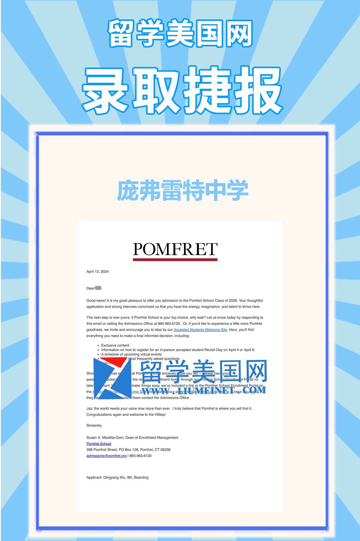 刚刚,迈润肯又收到一枚美高补录offer—康州温德姆顶尖私立高中庞弗雷特中学(Pomfret School),迈润肯留学2024美高录取榜单高速刷新中!