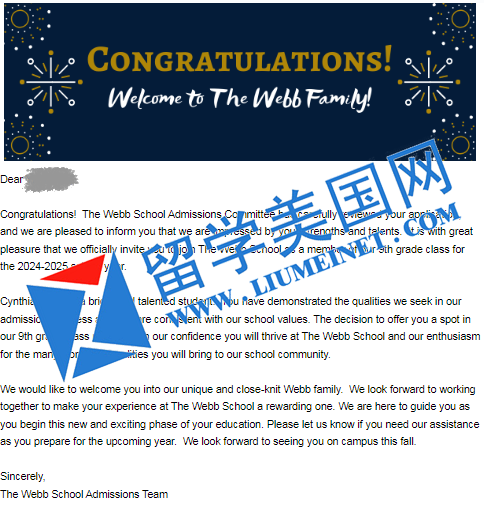 恭喜S同学收获韦伯中学The Webb School 录取offer。我们衷心祝贺S同学,她有很不错的独立能力和很好的深入研究能力。能够拿到录取是她不断努力的结果,同时也是留美网和学生家庭互相配合的成果。祝愿S同学能够珍视这样的机会,能够保持对知识的渴望,同时学会利用机会弥补自身的弱点,同时在美高获得理想的学习成果。